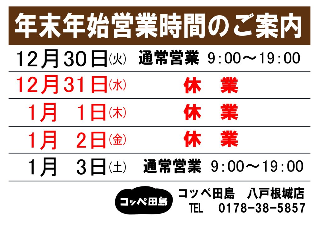 年末年始につきまして、下記の通り営業時間を変更させて頂きます。