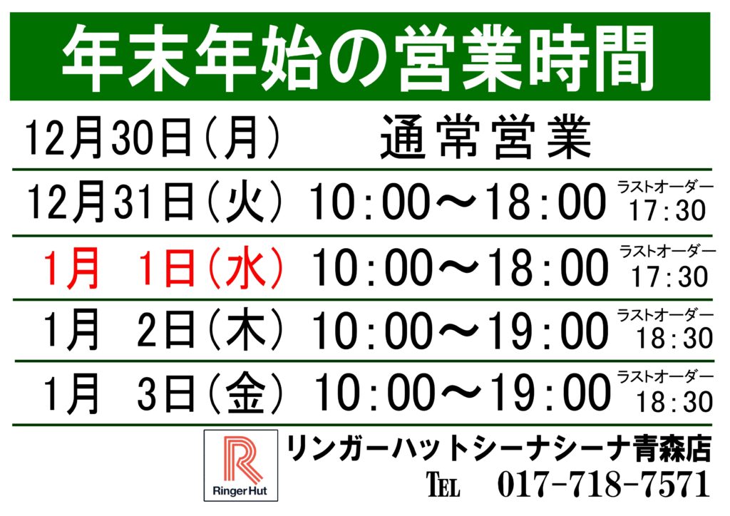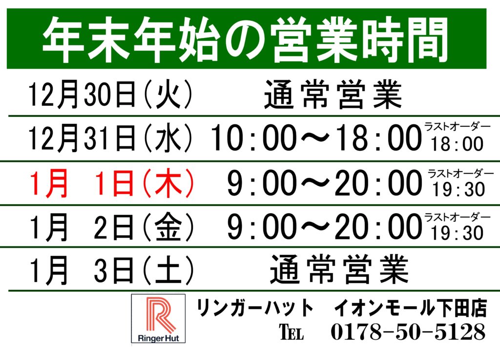 【年末年始の営業時間 リンガーハット】 2025年12月25日 最終更新日時 : 2025年12月25日 asakura 平素より格別のお引き立てを賜り、厚く御礼申し上げます。 年末年始につきまして、下記の通り営業時間を変更させて頂きます。 何卒ご理解下さいますようお願い致します。これからも変わらぬご愛顧の程よろしくお願い申し上げます。 Djuusanダウンロード